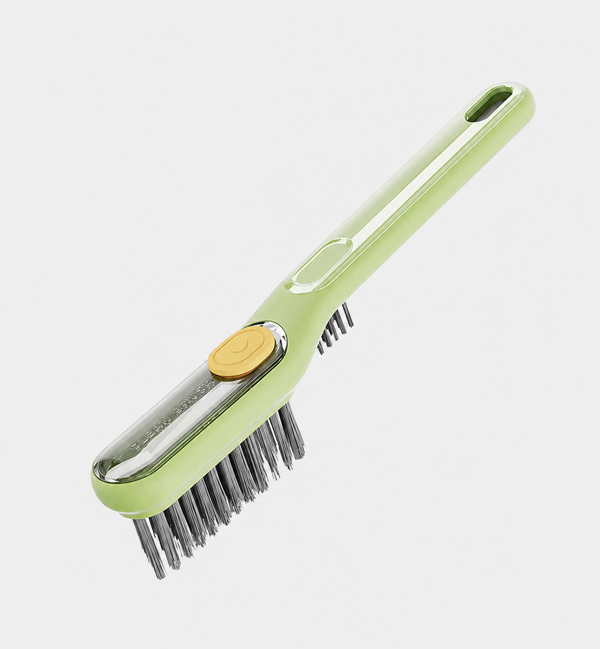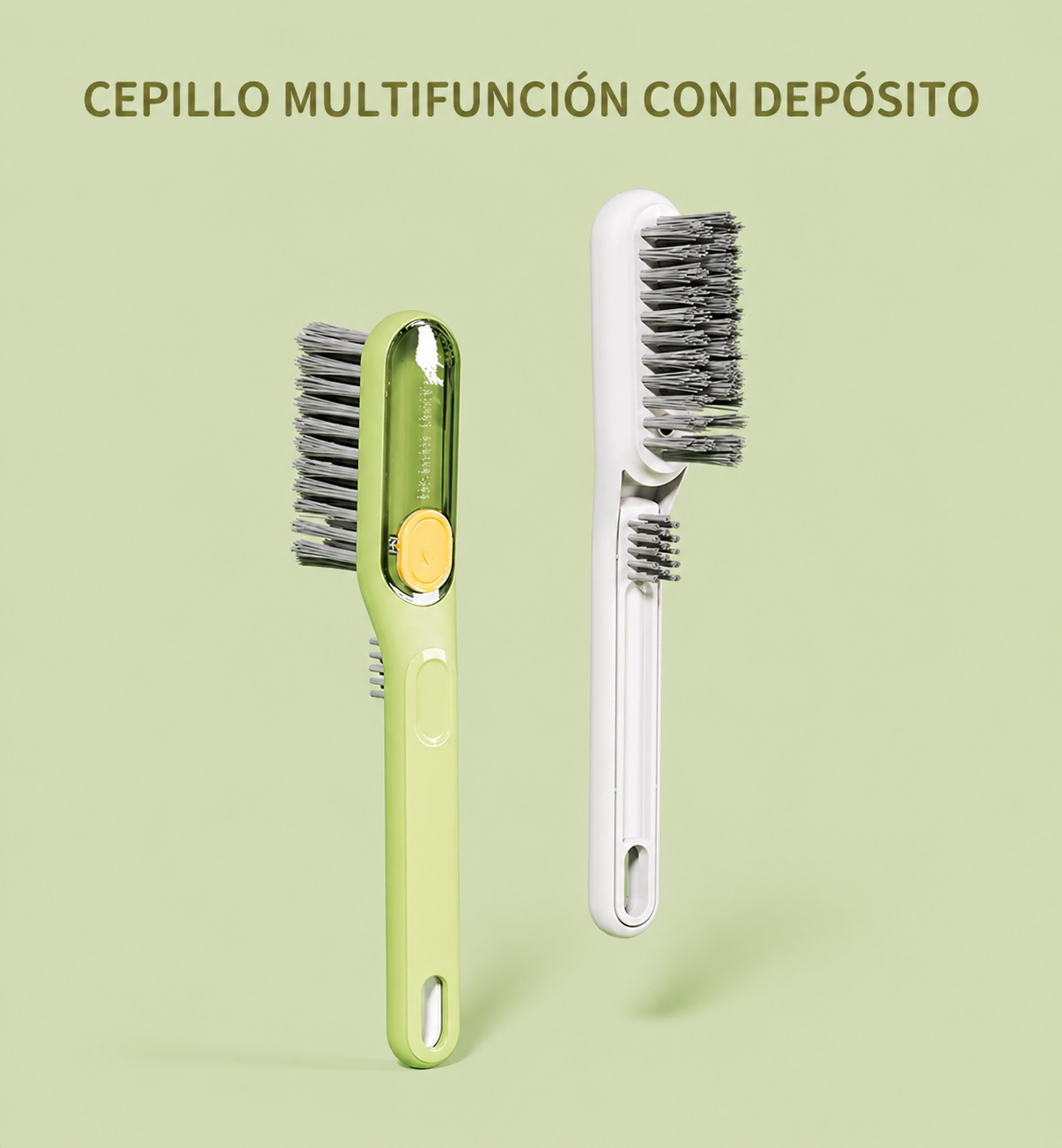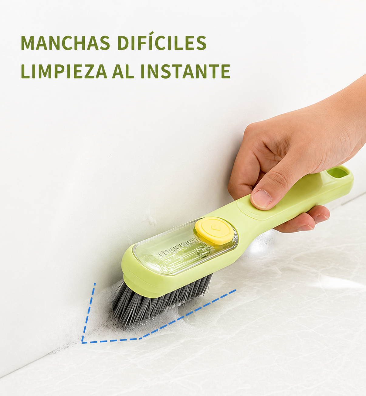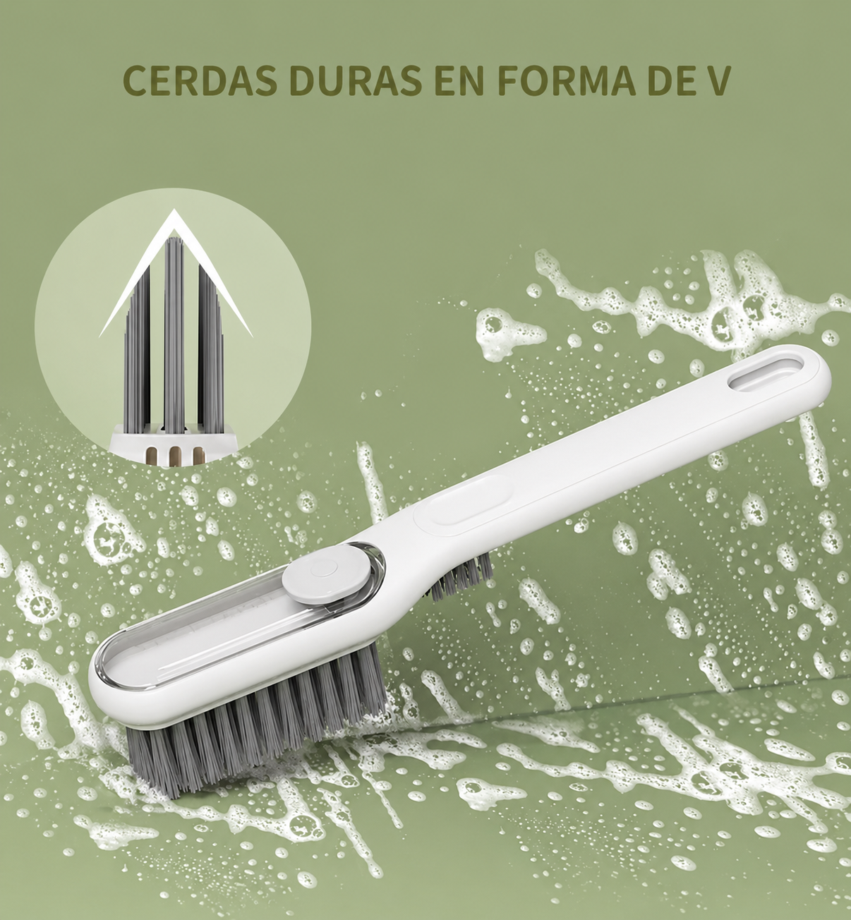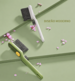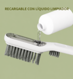 Cepillo Grande Dosificador (Para Juntas y Rieles): Posee un cuerpo de excelente tamaño para un agarre cómodo y un depósito integrado para cargar detergente o limpiador. Su cabezal tiene una terminación en forma de V con cerdas de polímero firme, diseñada específicamente para calzar en las juntas de los azulejos, rieles de ventanas y esquinas difíciles, liberando el jabón a medida que fregás.