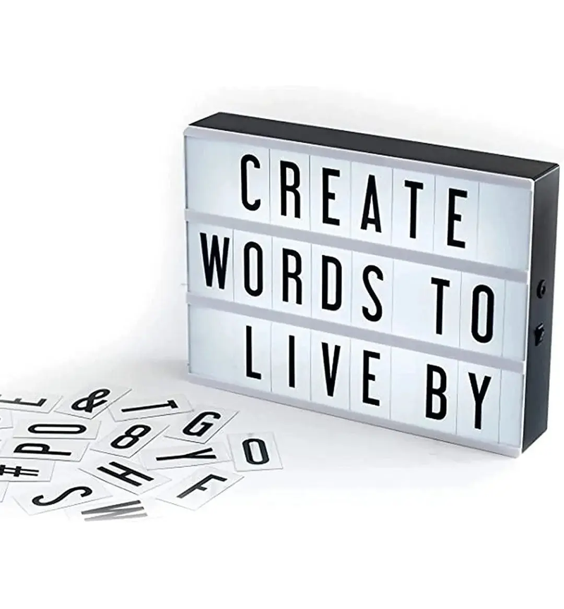 🔹 Kit Completo de Caracteres: Incluye un set de láminas transparentes con letras, números y símbolos (corazones, estrellas) en color negro para que puedas armar cualquier combinación que imagines. 🔢🖤 🔹 Tamaño Impactante: Con unas dimensiones de 30 cm de largo, 22 cm de alto y 4 cm de profundidad, ofrece tres filas de exhibición con espacio suficiente para frases cortas y legibles. 📏 🔹 Iluminación LED Uniforme: Proporciona una luz suave y blanca que resalta los caracteres sin deslumbrar, ideal para crear una atmósfera acogedora. 💡✨ 🔹 Portátil y Versátil: Puede utilizarse sobre superficies planas o colgarse en la pared, adaptándose fácilmente a la decoración de livings, dormitorios infantiles o vidrieras comerciales. 📍