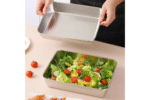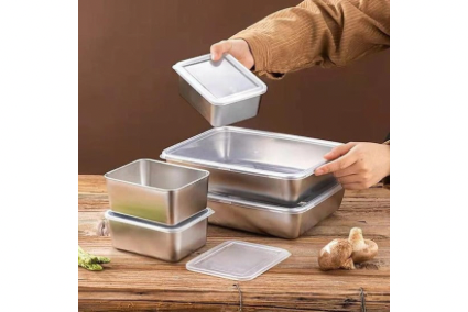 Contenedor de acero inoxidable con tapa hermética transparente.
