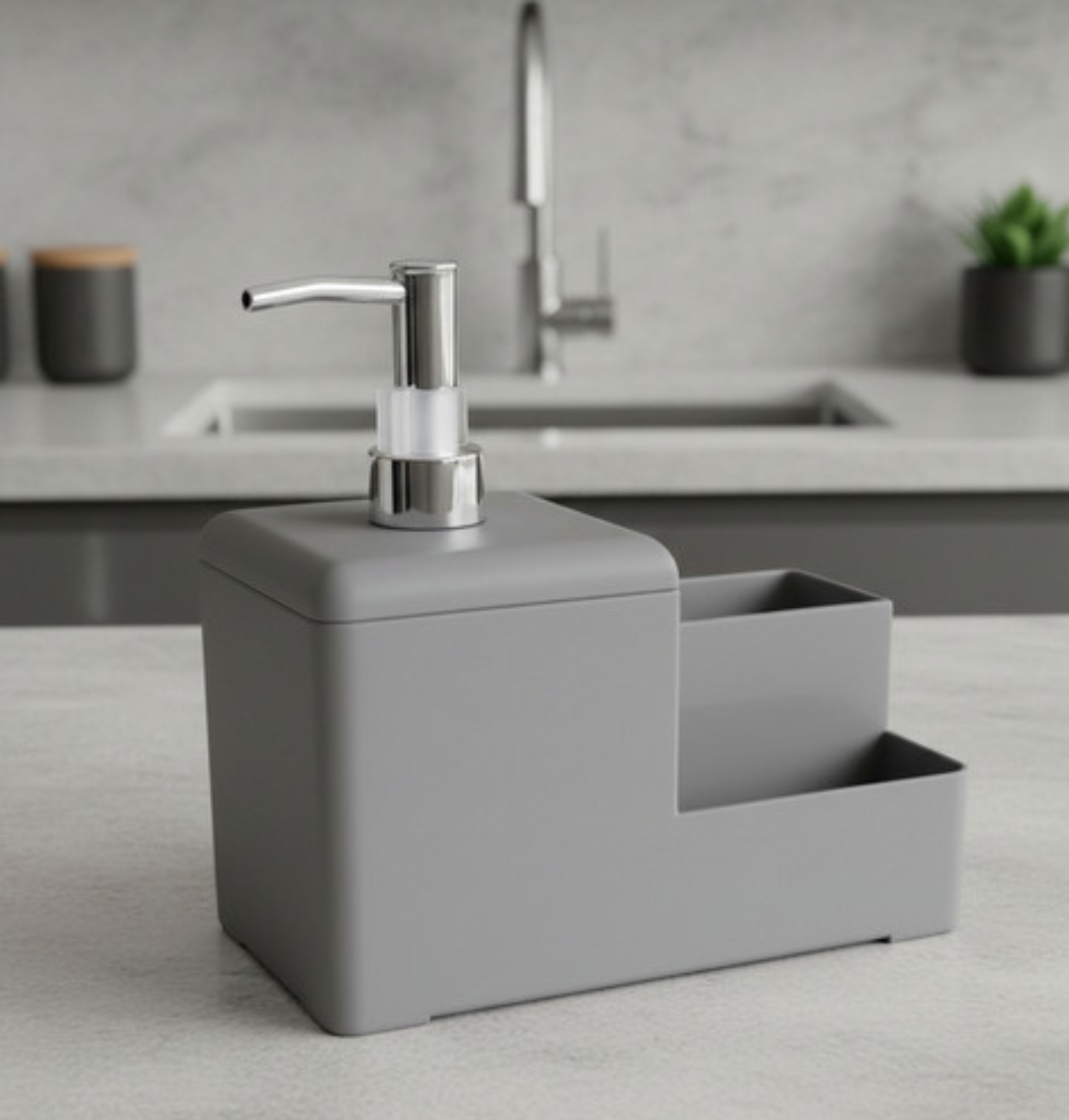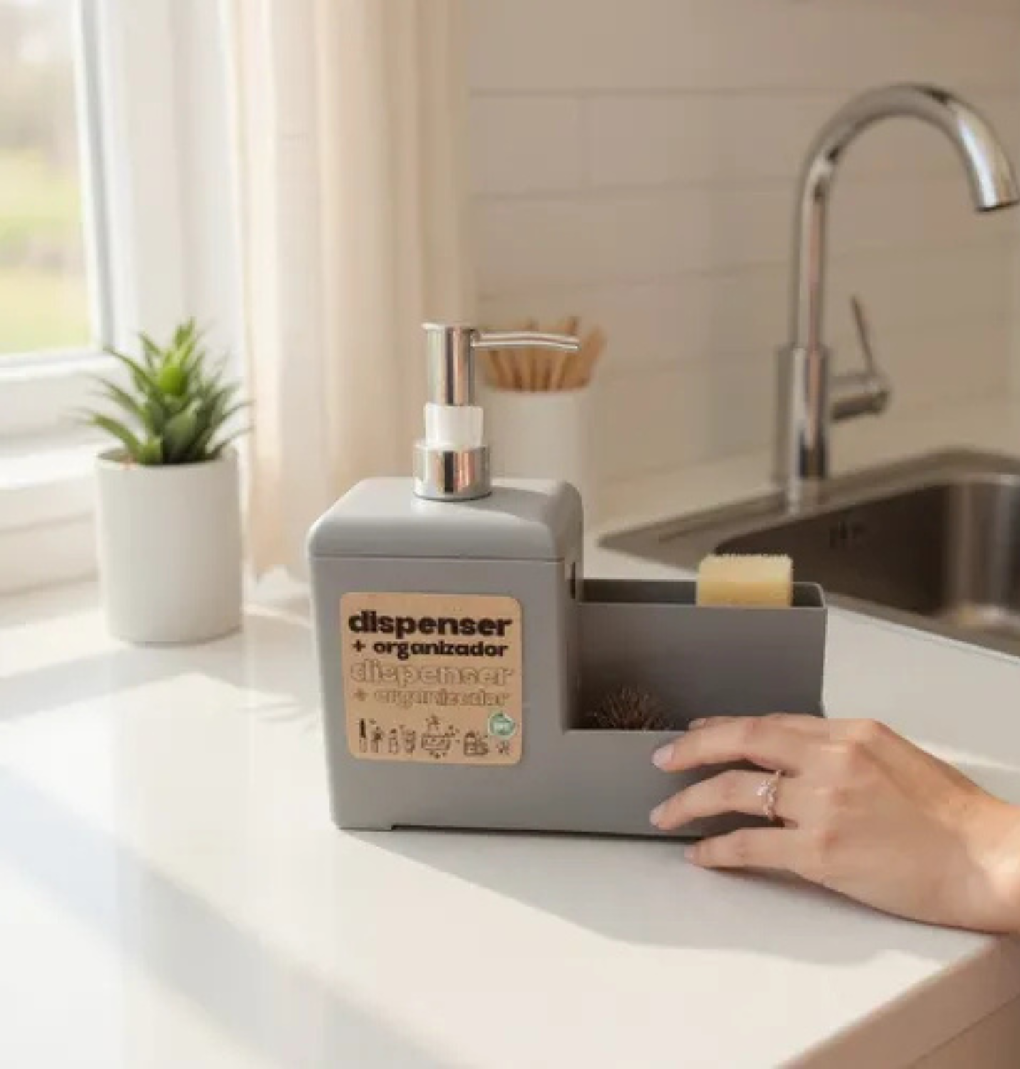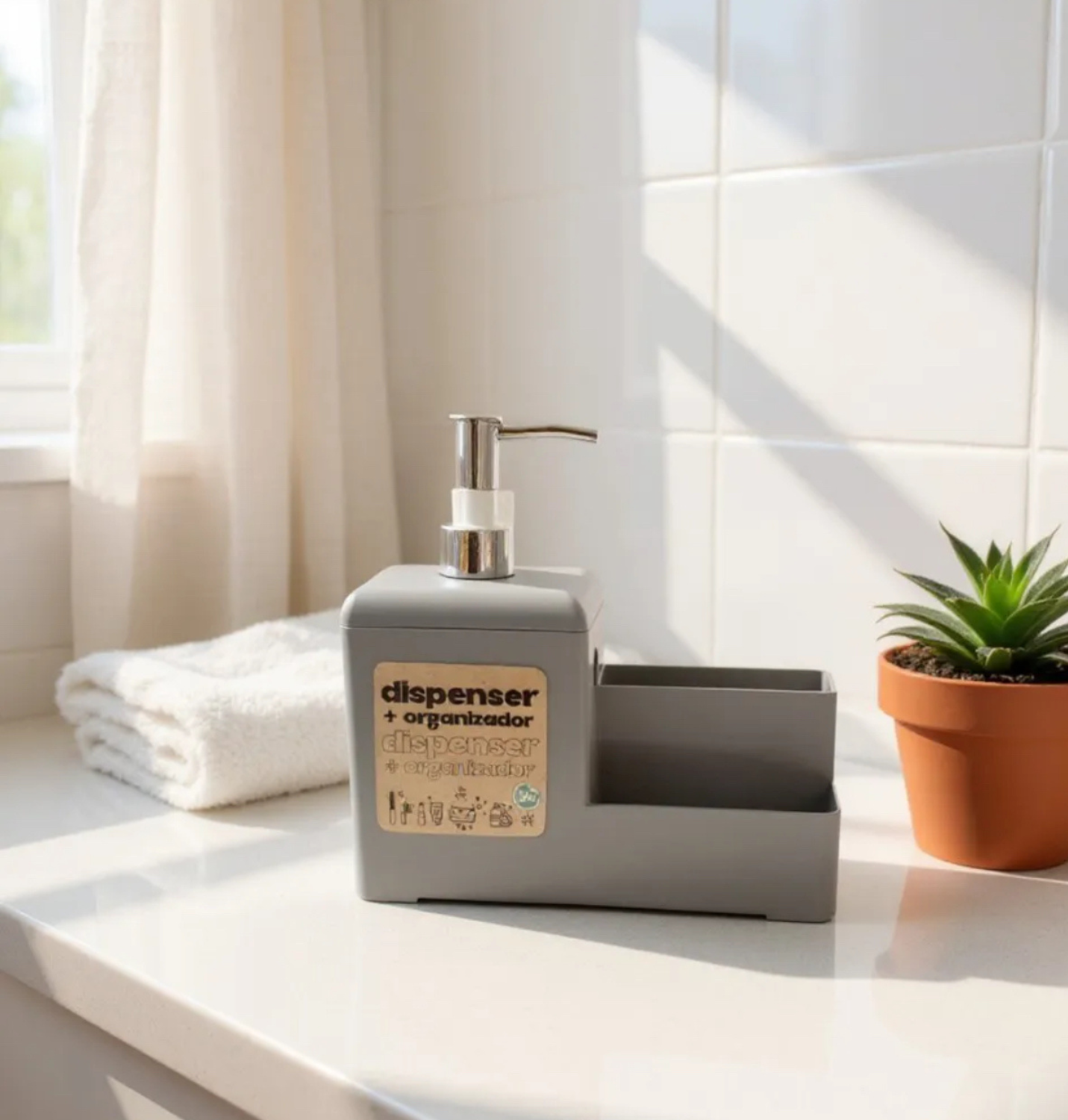 Optimizá el espacio de tu cocina o baño con el Dual-Clean. Este accesorio integra en una sola pieza un dispenser de jabón líquido o detergente y un práctico compartimento organizador. Su diseño de líneas limpias y acabado mate texturado aporta modernidad a cualquier ambiente, manteniendo tus elementos de limpieza ordenados y siempre al alcance.✅