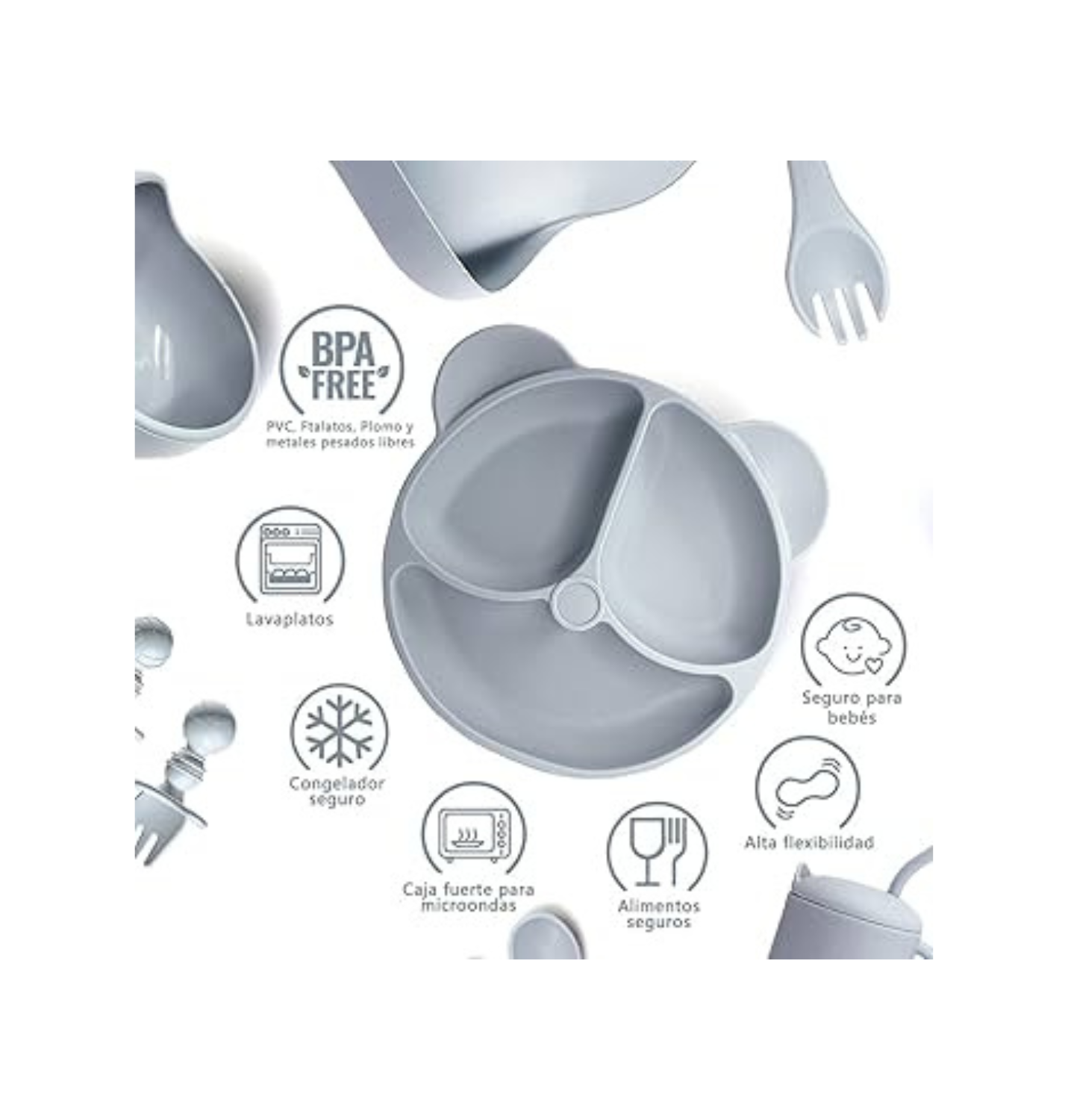 100% Silicona Premium: Es un material flexible y extremadamente duradero que no se rompe si se cae. Es libre de BPA, ftalatos y plomo, cuidando la salud de tu bebé. 👶