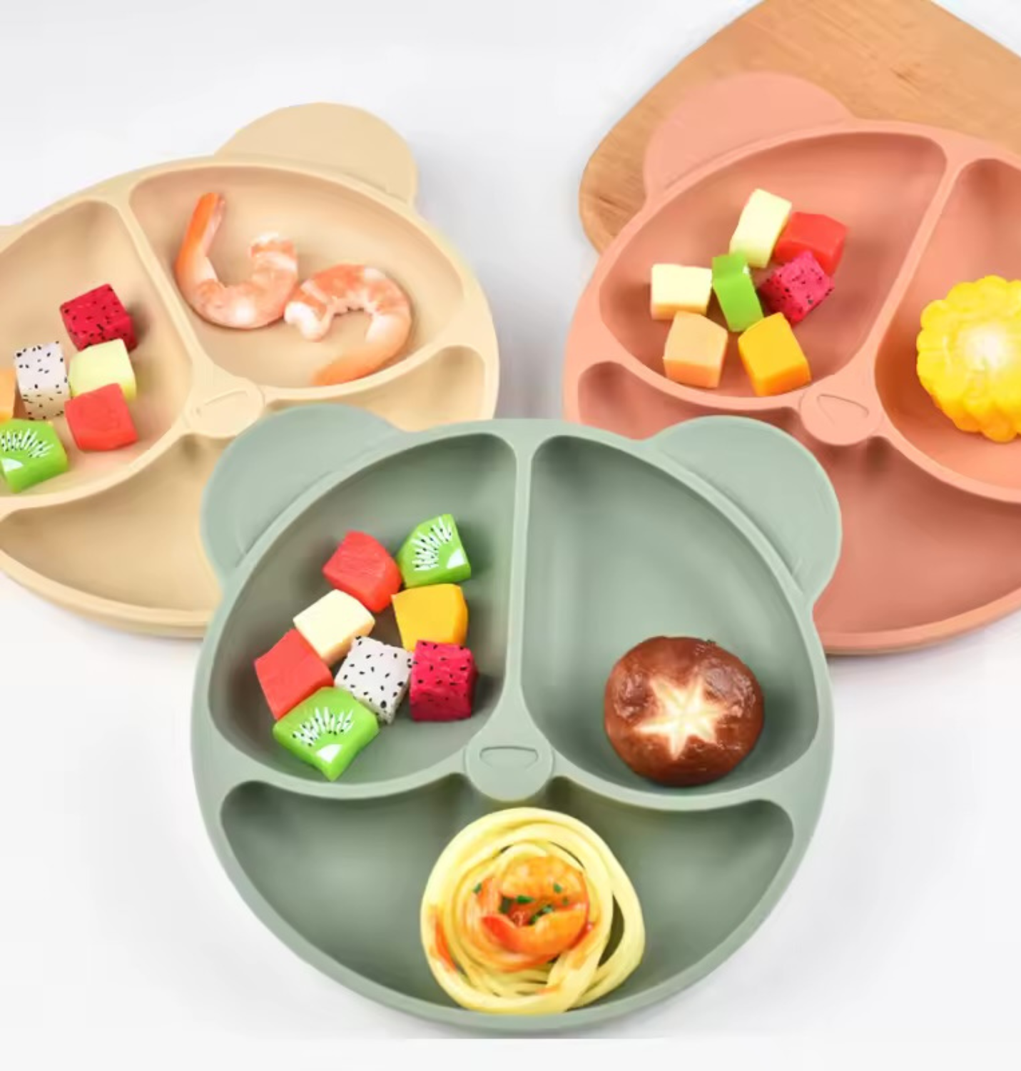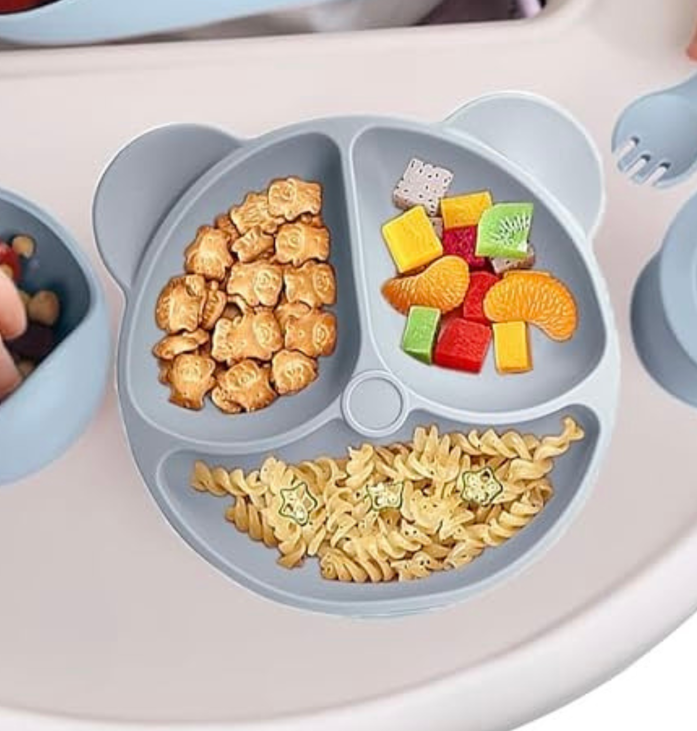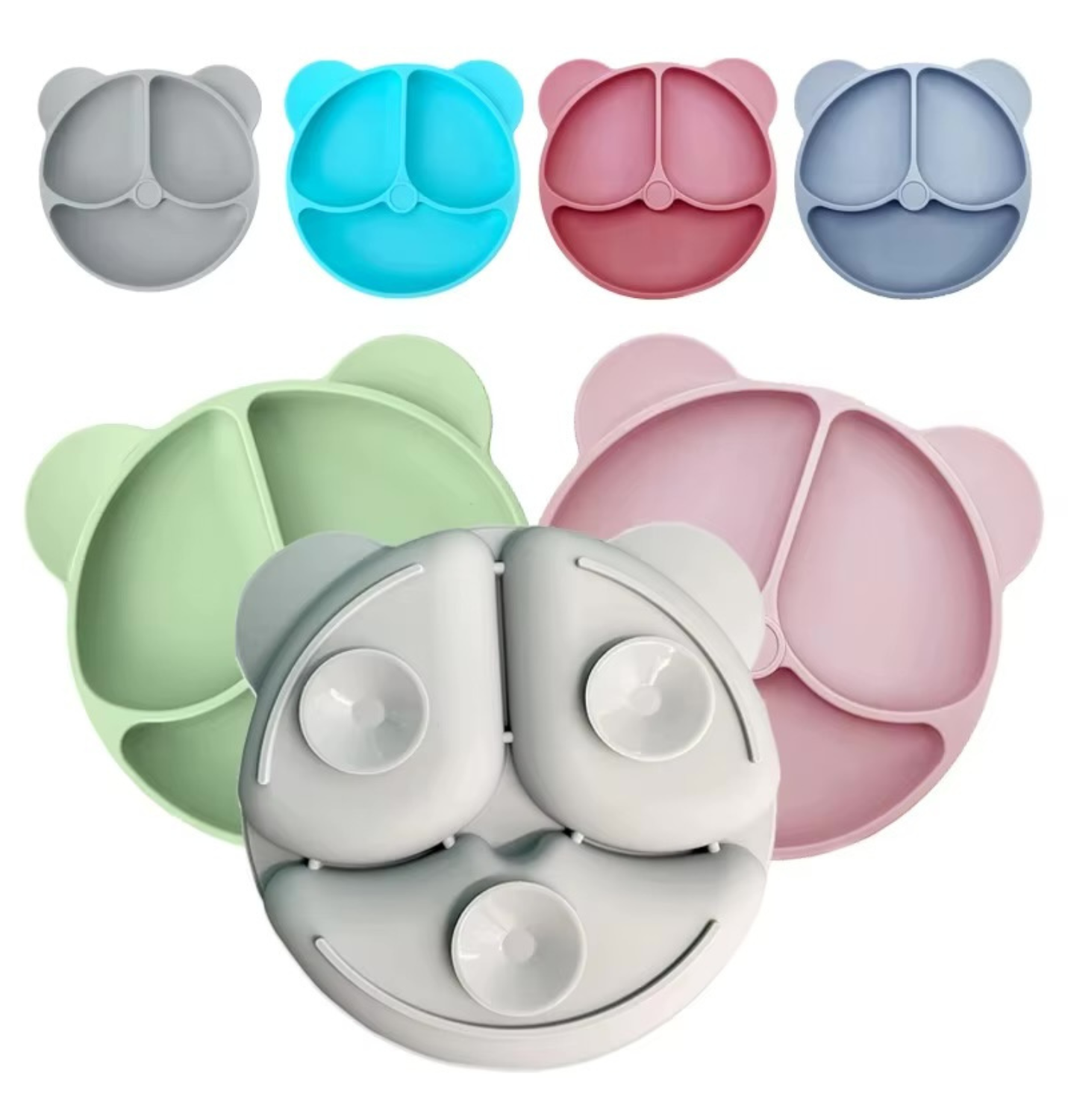 Diseño con 3 Compartimentos: Las divisiones (rostro y orejas del oso) permiten separar los alimentos, ideal para el método BLW o para niños que prefieren que sus comidas no se mezclen. 🍎