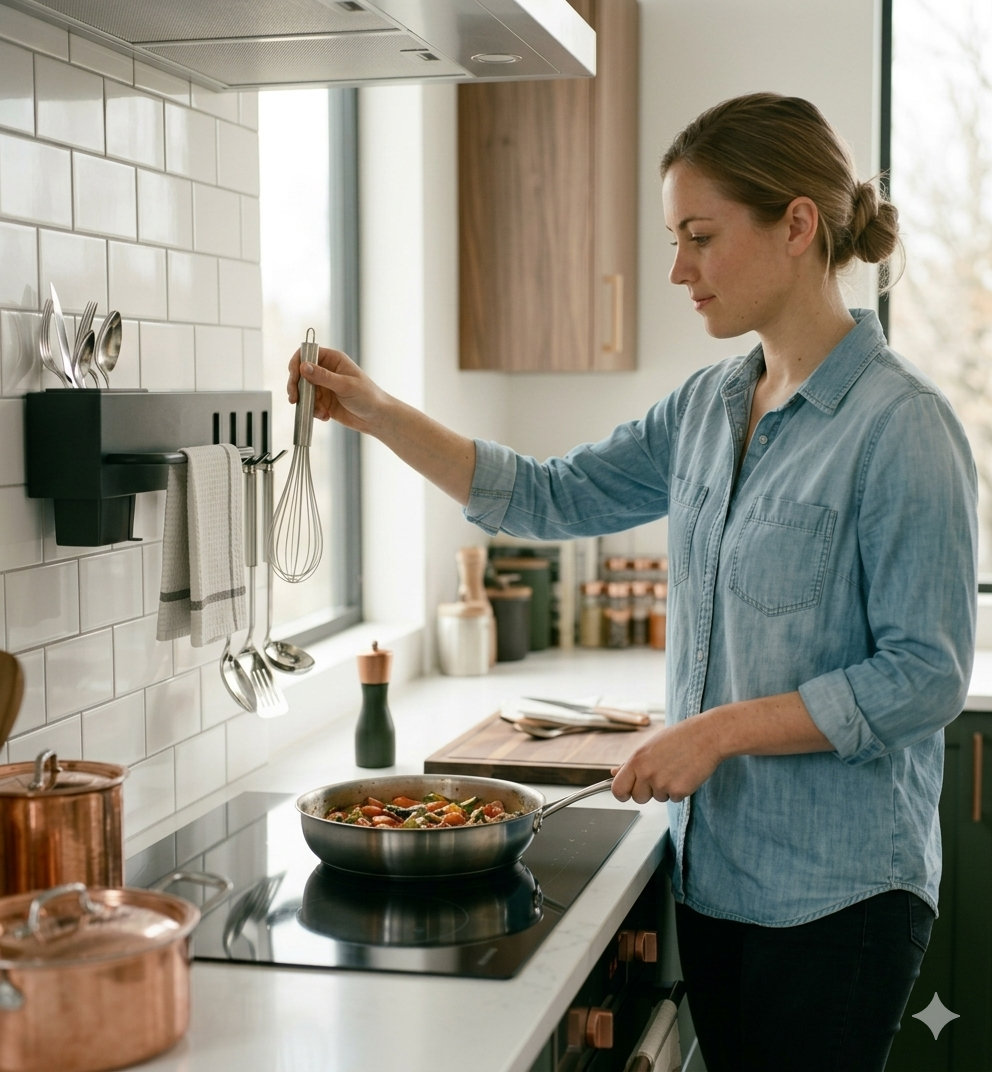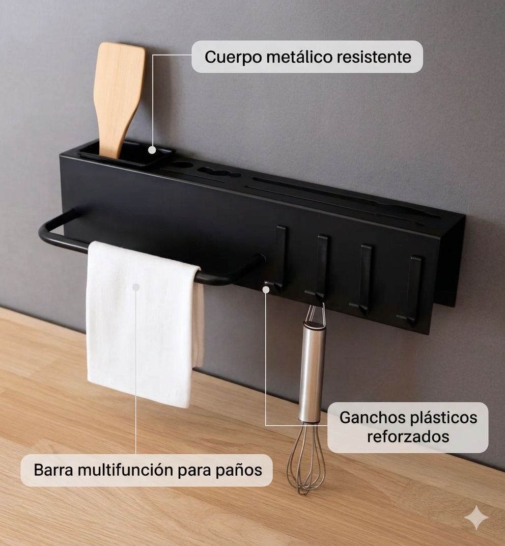 Ganchos Reforzados: Incluye ganchos móviles ideales para colgar espumaderas, batidores, espátulas o tazas. 🥄