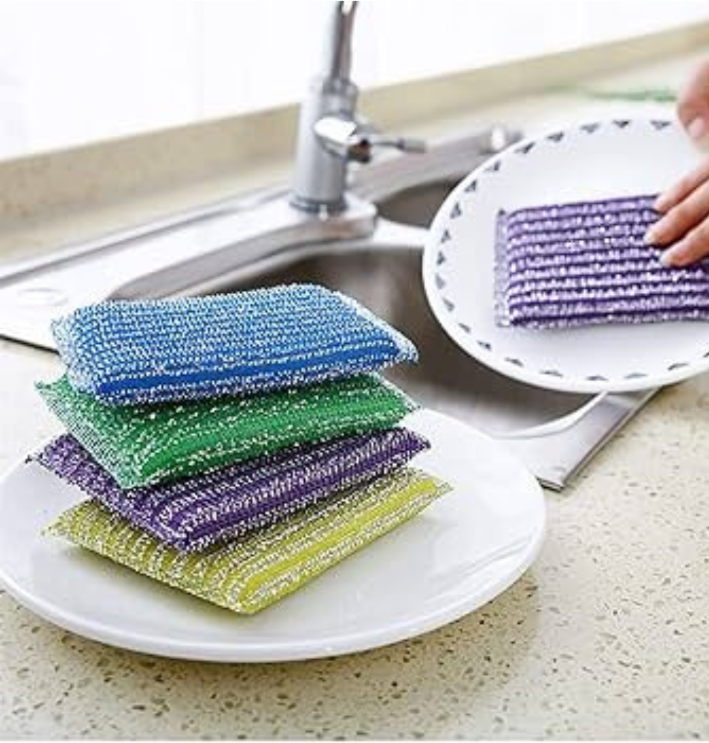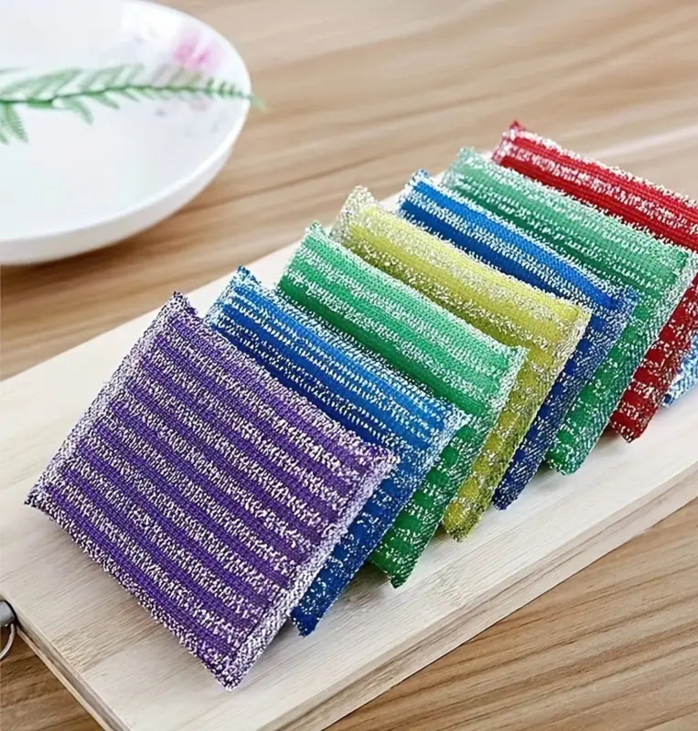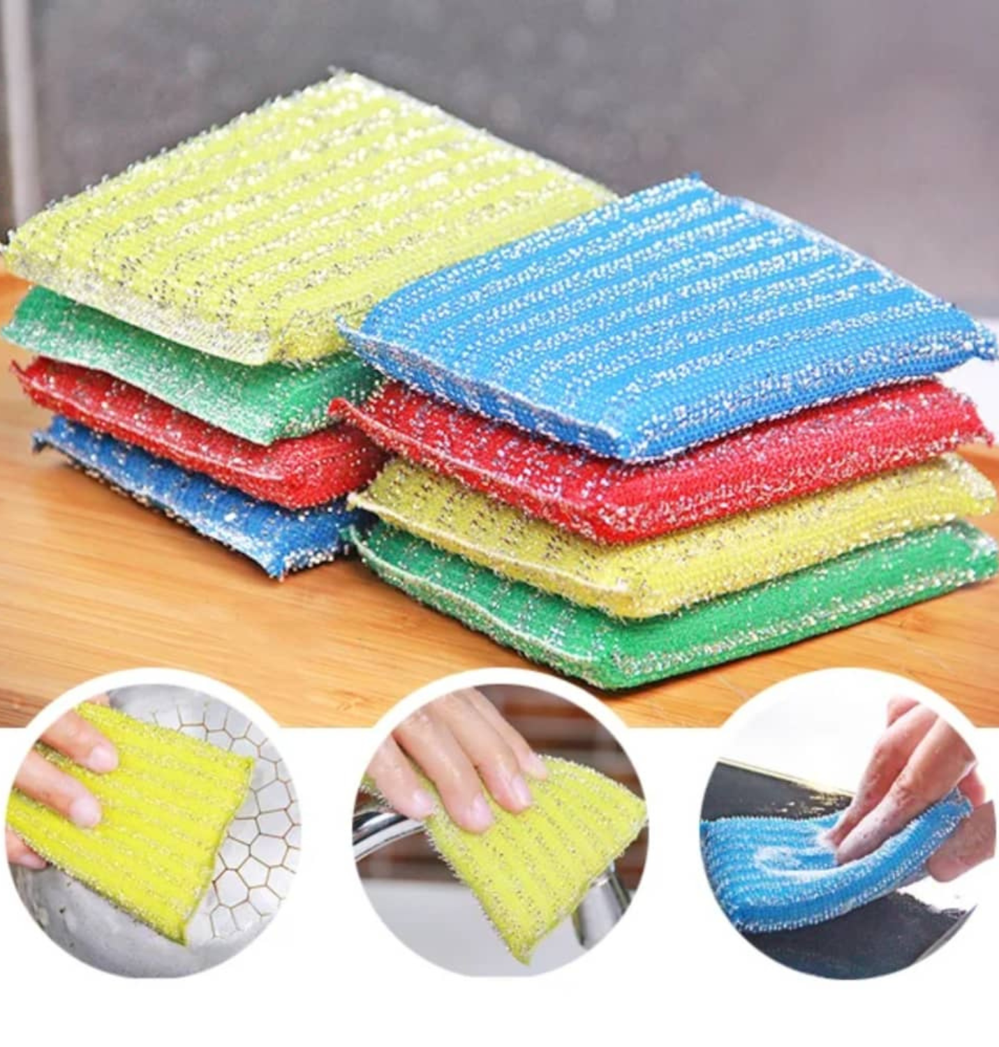 Estas esponjas están fabricadas con un material de fibra sintética de alta calidad, diseñadas para ser resistentes pero amigables con tus superficies. 🧼 Lo mejor es que su textura permite remover restos de comida y suciedad difícil sin necesidad de refregar de más, cuidando la vida útil de tus utensilios.